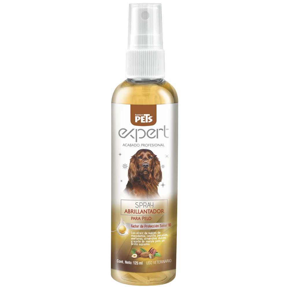 Spray abrillantador con protección solar para pelo de perro. Beneficios: El Spray Abrillantador para Pelo de la línea Expert de Fancy Pets es un producto formulado a base de la mezcla de aceites preciosos de nueces de macadamia, castilla, pacanas, avellanas y almendras dulces para obtener el toque supremo en el pelo de su mascota, brillo envidiable, suave y sedoso al tacto. Además, contiene FPS 10 que protege de los efectos nocivos de los rayos UV en la piel y el pelo de su mascota. Es ideal para perros de pelo largo y corto dejándolos relucientes.