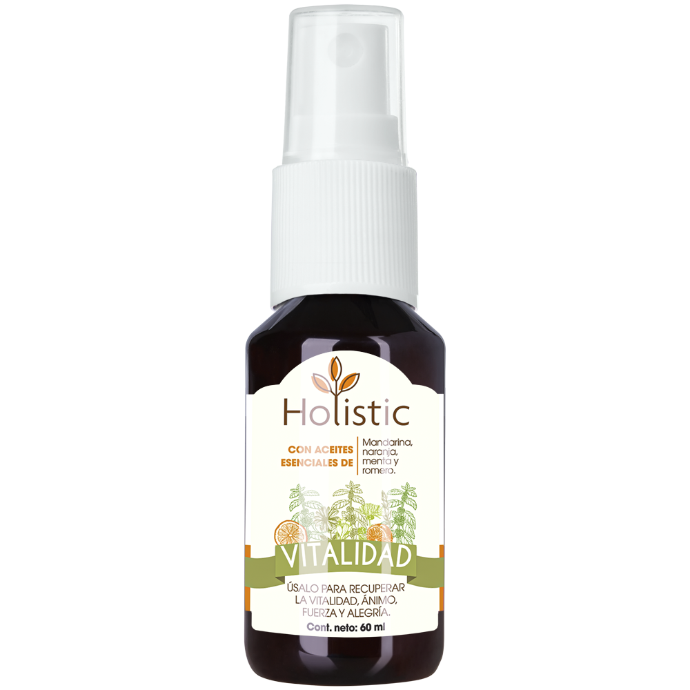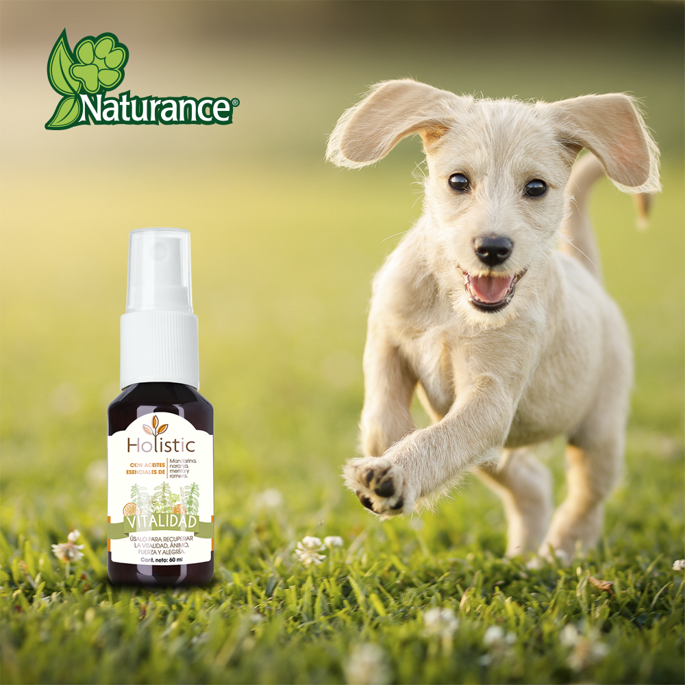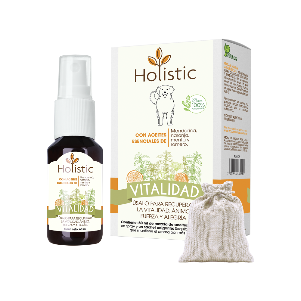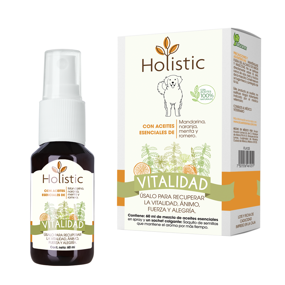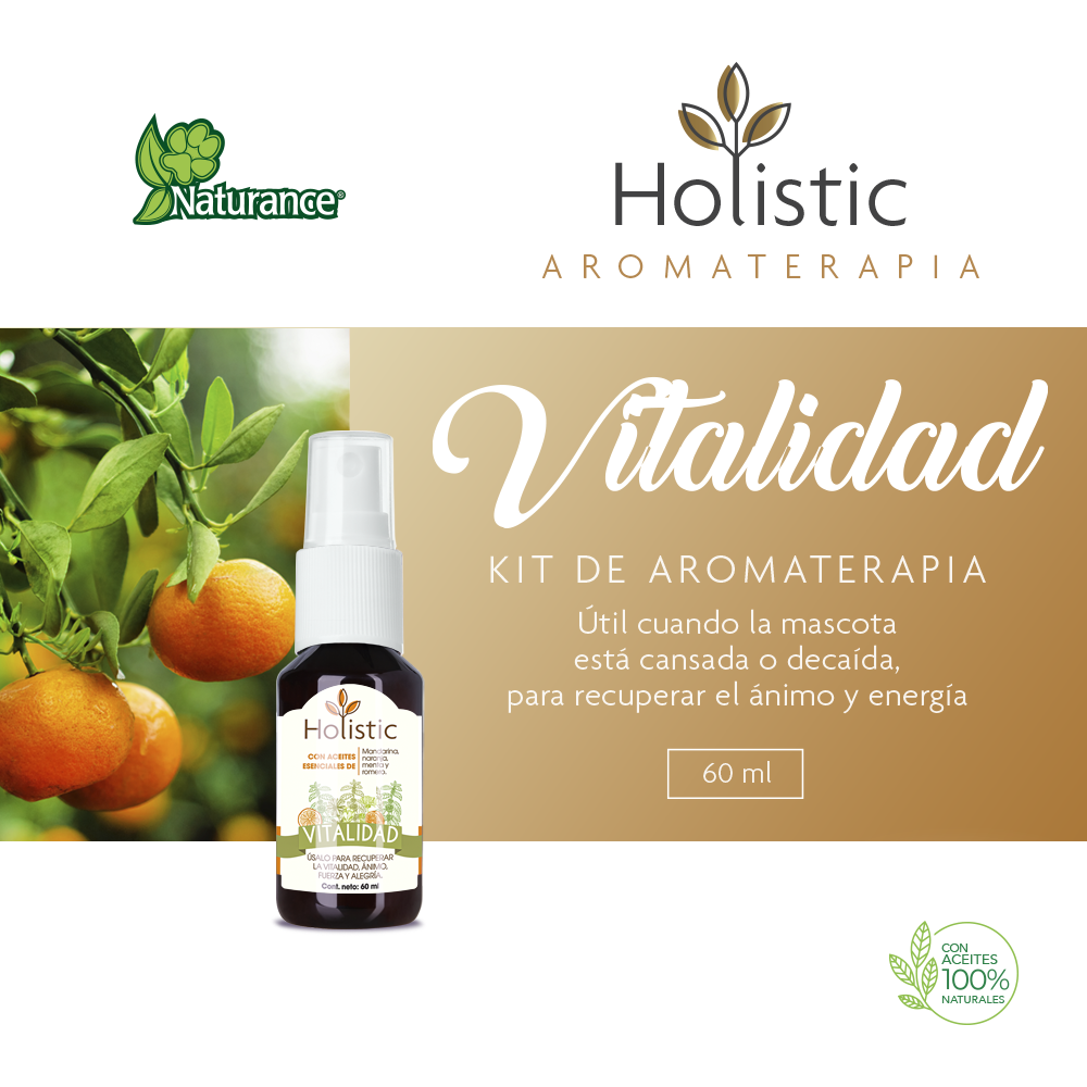 Mezcla de aceites esenciales 100% naturales de mandarina, naranja, menta y romero. Beneficios: útil para usarse cuando su mascota se sienta cansada o decaída, para recuperar la vitalidad, ánimo, fuerza y alegría.