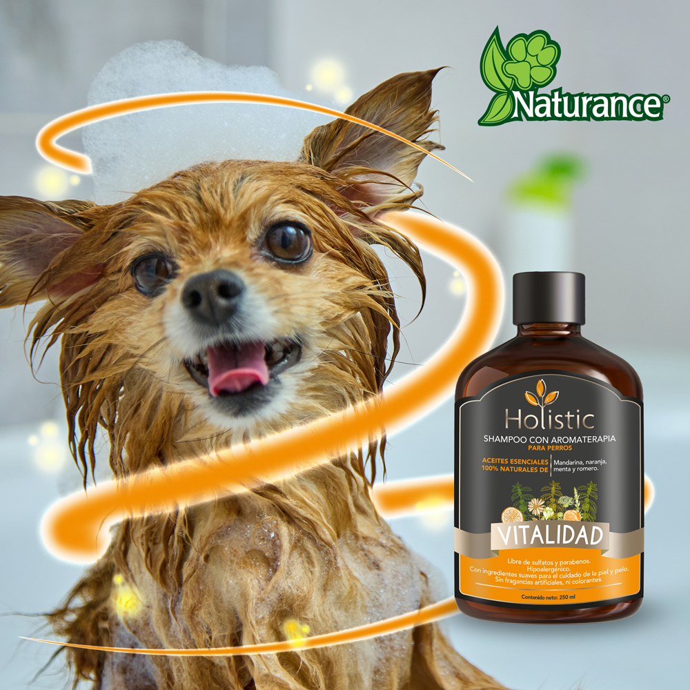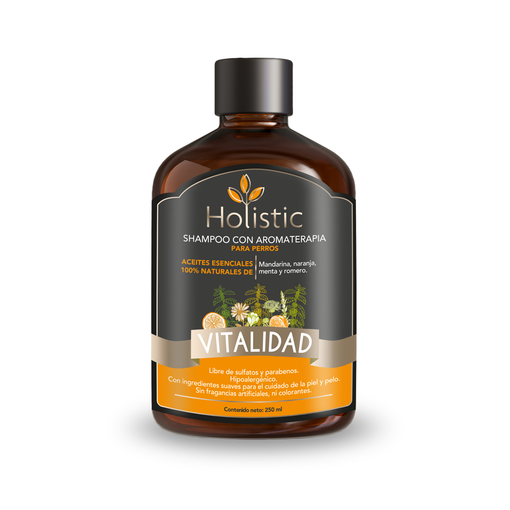 El shampoo con aromaterapia VITALIDAD de la línea Holistic puede usarse cuando tu mascota está cansada o decaída. Brindando un baño de ánimo, fuerza y alegría. No irrita la piel del perro y deja un agradable aroma relajante para tu mascota.