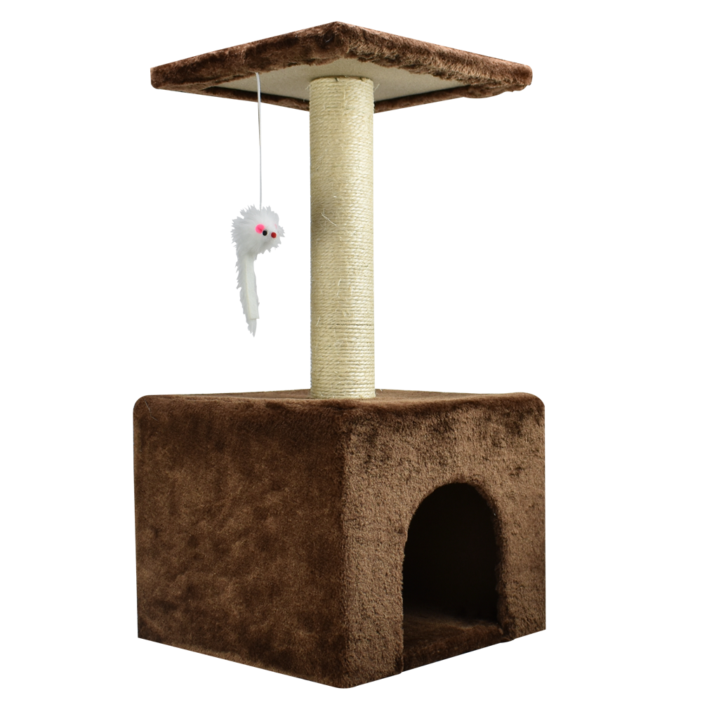Cueva en forma de cubo, poste rascador, juguete y plataforma de descanso.